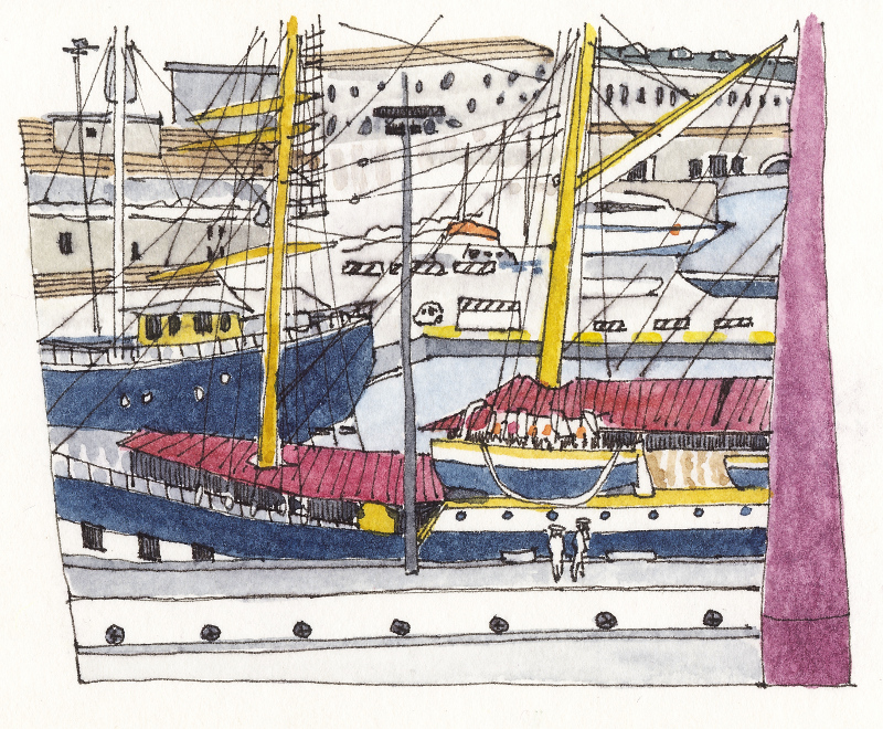 E alla fine, il traghetto della Corsica Ferries ci ha riportati a casa. Un vento poderoso ha fatto da sottofondo a quest'ultimo disegno.