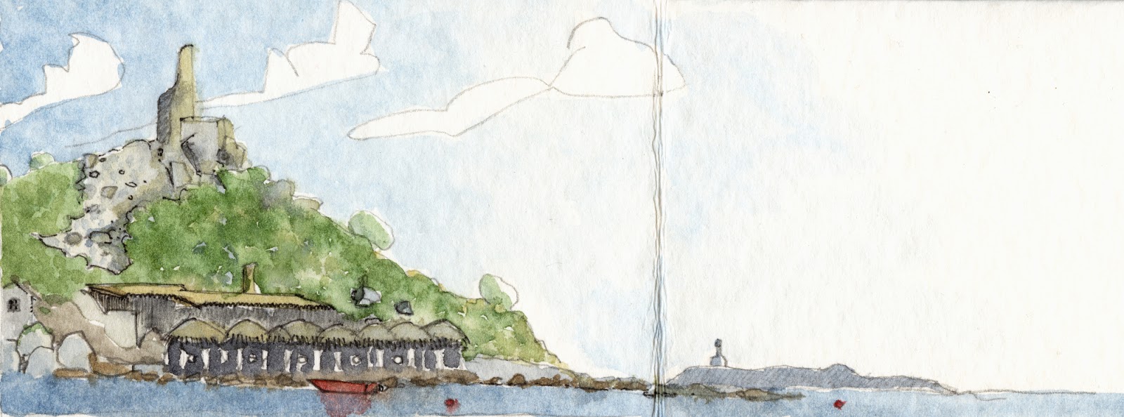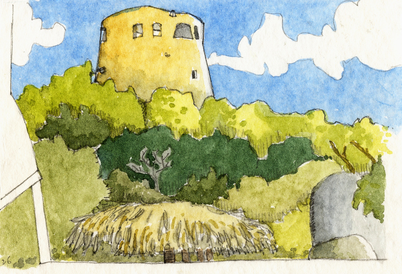 Siamo sempre stati dei buoni viaggiatori, fin da quando eravamo giovani: treno, auto, Vespa, aerei e quant'altro, ma da quando è nata Olivia, quasi due anni fa, la praticità ha preso il sopravvento e i viaggi si sono fermati. Tuttavia, la scorsa estate, complice il prolungarsi del bel tempo e grazie a convenienti offerte di una stagione in chiusura, ci siamo concessi una decina di giorni nel sud della Sardegna, attraversandola tutta da Olbia a Villasimius in una bizzarra giornata in cui, nei pressi di Lanusei, ho incontrato il banco di nebbia più fitto che abbia mai visto in tutta la mia vita: due-tre metri di visibilità su strade tortuose e interrotte da passaggi a livello privi di sbarre. Incredibilmente, giunti a destinazione, abbiamo passato dieci giorni d'incanto. E sketchbook, penne e acquerelli sono stati un ottimo complemento di una vacanza all'insegna dell'esplorazione. Perché a Villasimius e dintorni non ci sono incredibili resti archeologici e vestigia di antiche città da visitare, non ci sono metropoli né architetture importanti, ma c'è una natura mozzafiato (purtroppo talvolta mortificata con rifiuti, lasciati da turisti e locali) e un mare incredibile. Ecco i miei appunti su carta.